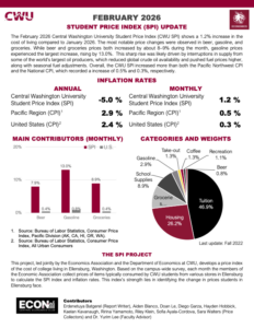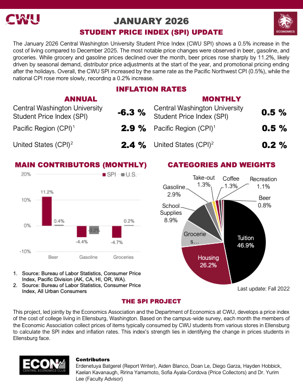This project, led jointly by the Economics Association and the Department of Economics at CWU, develops a price index of the cost of college living in Ellensburg, Washington. Based on the campus-wide survey, each month the members of the Economic Association collect prices of items typically consumed by CWU students from various stores in Ellensburg to calculate the SPI index and inflation rates. This index’s strength lies in identifying the change in prices students in Ellensburg face. We will updating this webpage with monthly reports. To see a larger view, click on the report to enhance it.